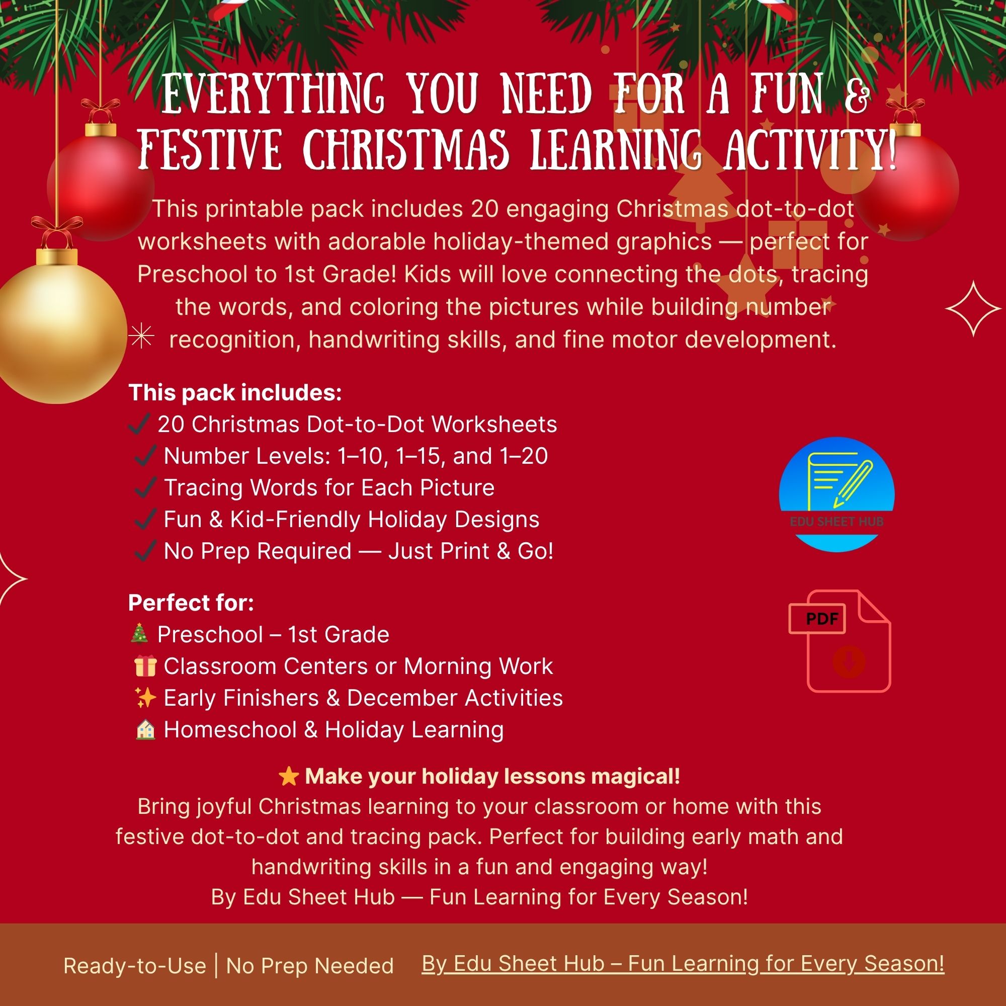 This holiday activity set includes 20 Christmas dot-to-dot worksheets designed to strengthen counting skills, number sequencing, handwriting, and fine motor development.