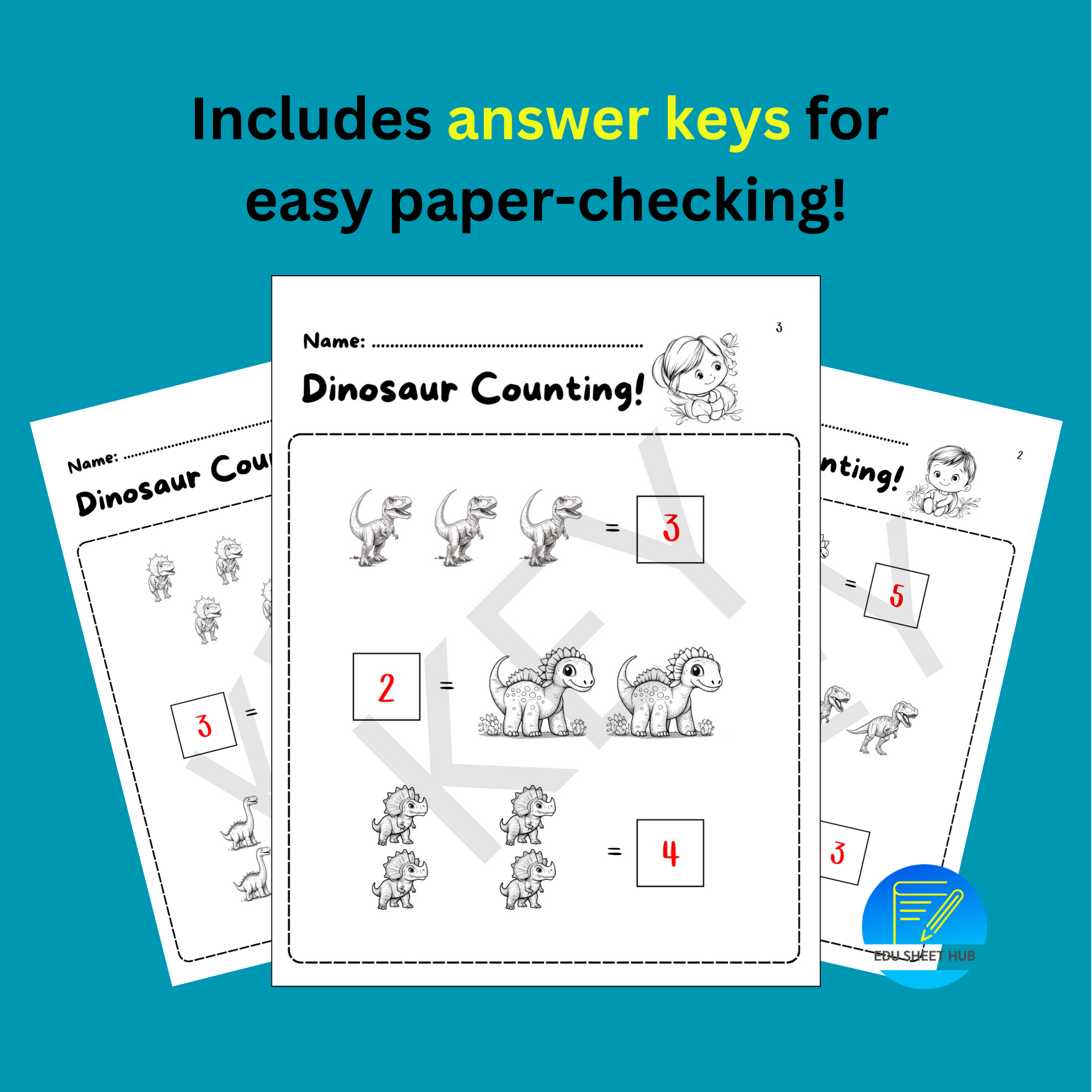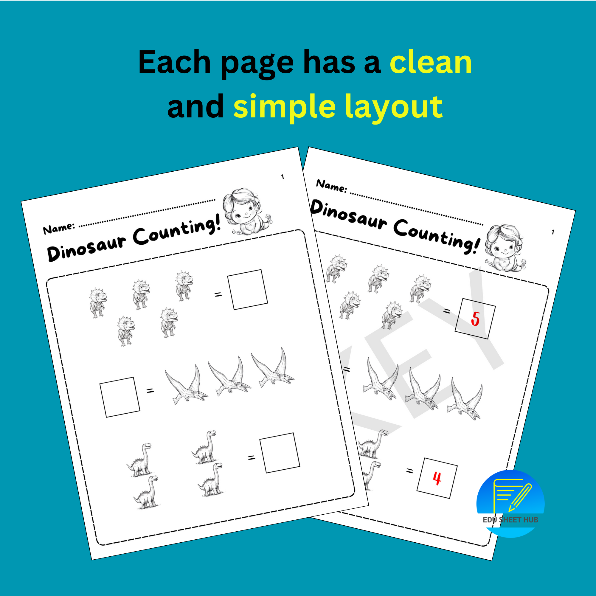 Make counting fun and engaging for little learners with this adorable set of Dinosaur Counting Worksheets, specially designed for preschool and kindergarten children! Each worksheet features charming dinosaur illustrations, allowing kids to practice counting objects (numbers 1-5) and write the corresponding number in the blank box provided. This hands-on activity is perfect for reinforcing early math skills, number recognition, and fine motor development.
