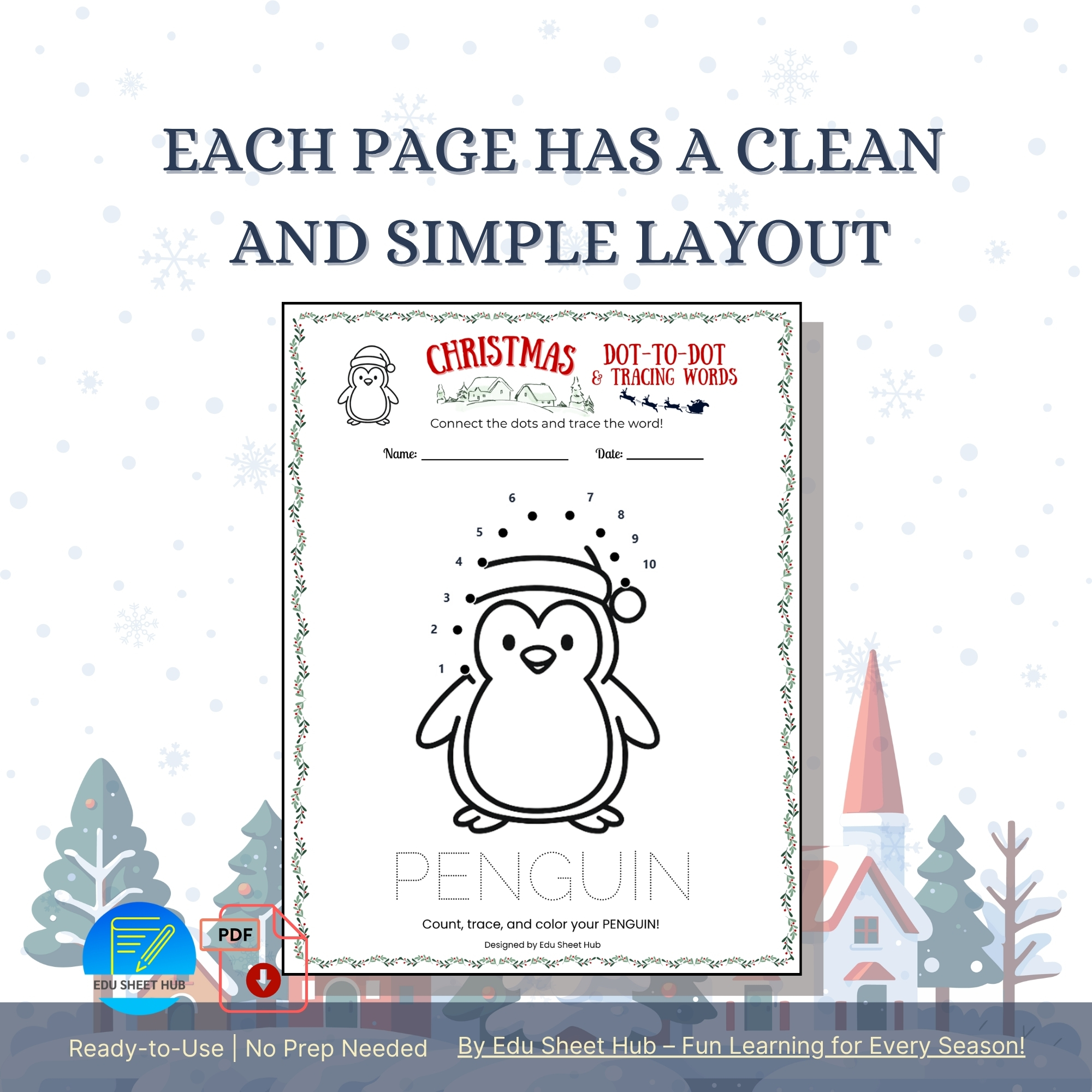 This set includes 3 adorable worksheets featuring a penguin, a holiday house, and a drum. Each page lets students: