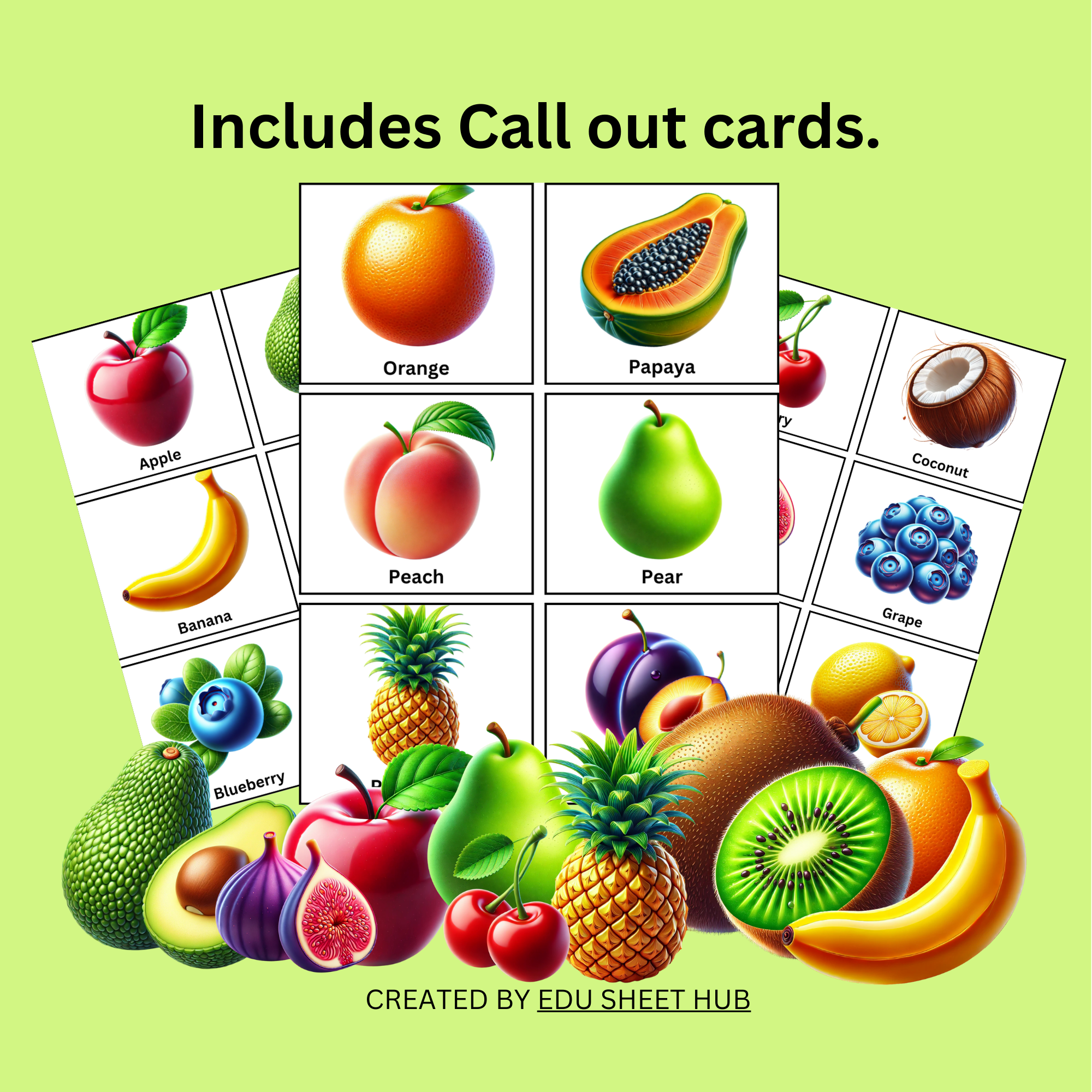 - 24 calling cards featuring colorful and recognizable fruit illustrations.