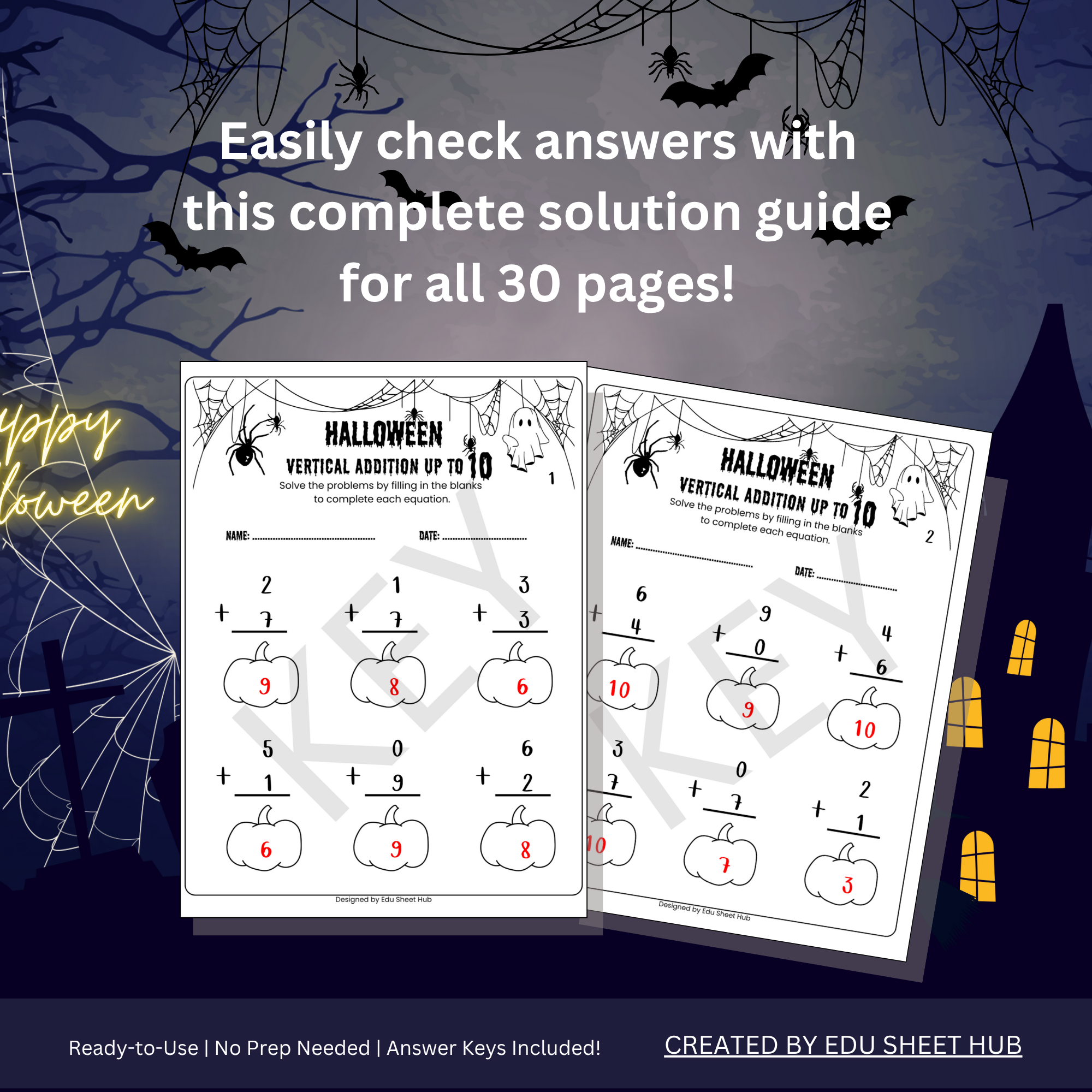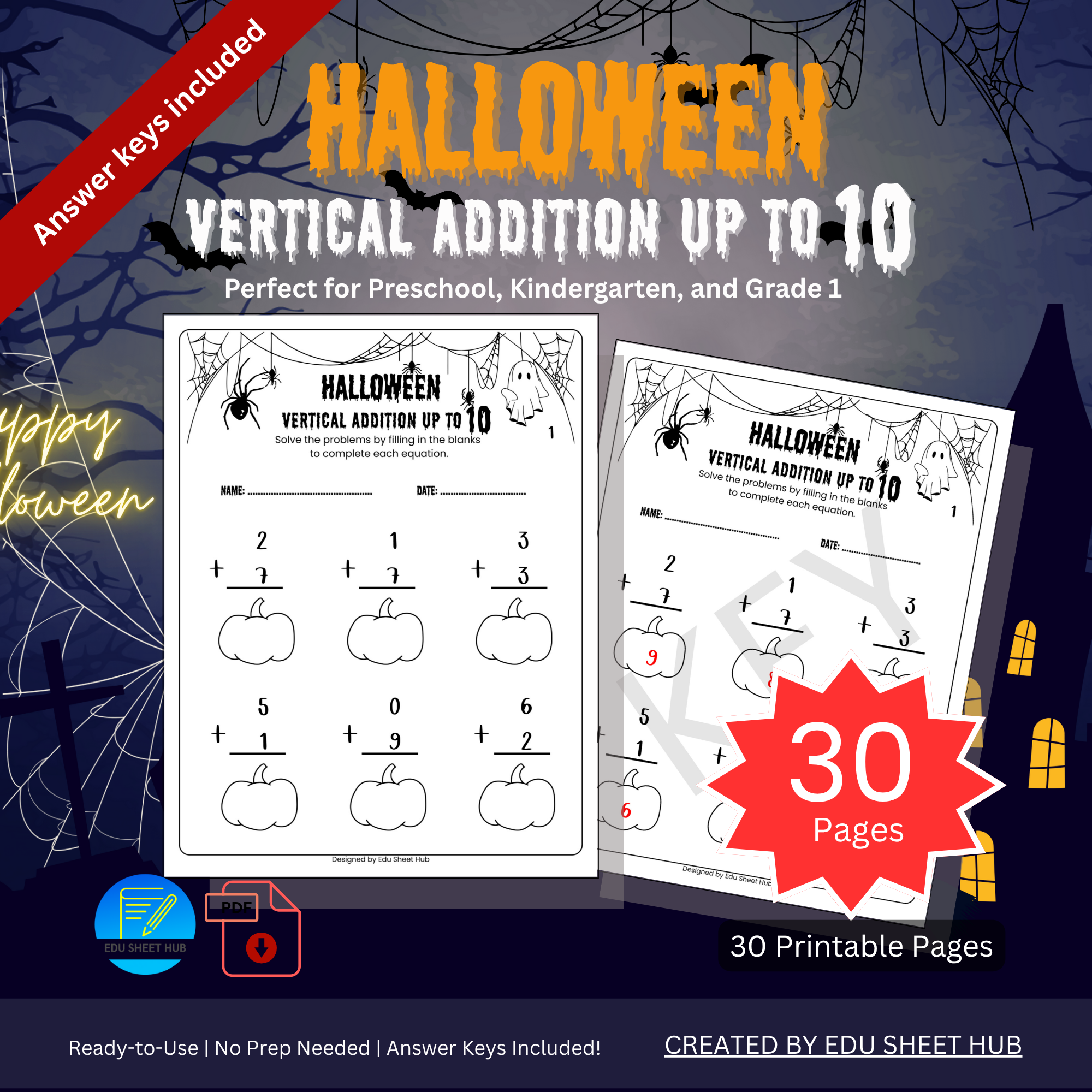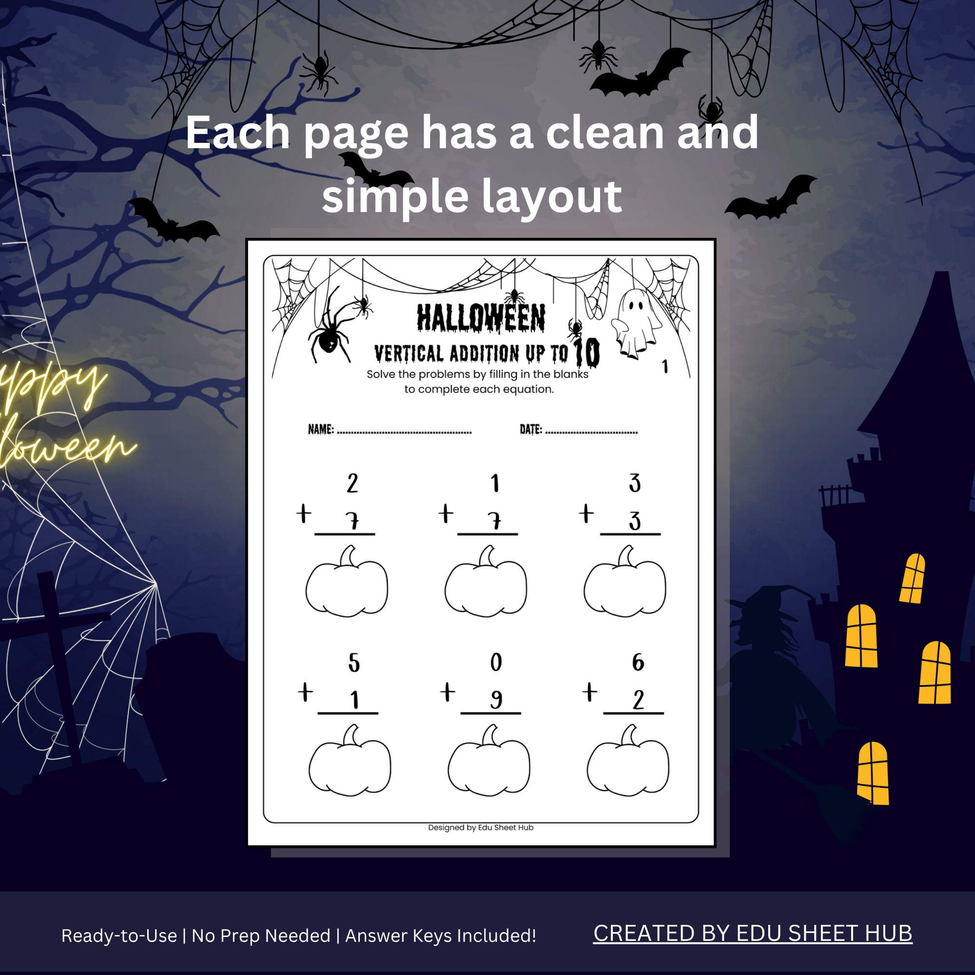 Make math practice festive and stress-free this Halloween season with this complete set of vertical addition worksheets! Inside you’ll find 30 ready-to-use practice pages covering sums up to 10, each designed with fun Halloween themes to keep students engaged and motivated.