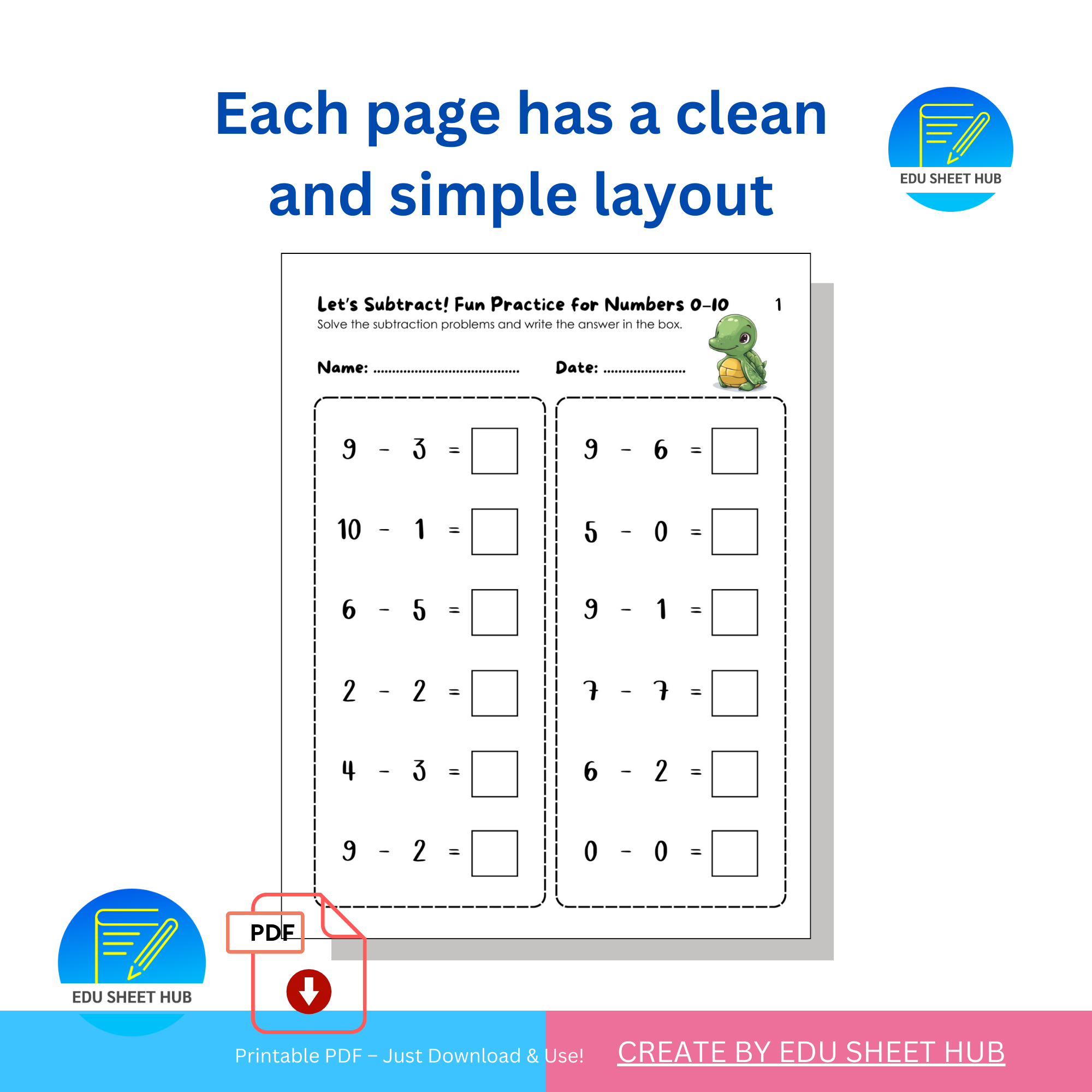 Make subtraction fun and engaging for young learners with this cute and easy-to-use worksheet pack! This resource includes 30 printable subtraction worksheets that focus on numbers 0–10, helping students build strong foundational math skills in a fun and stress-free way.