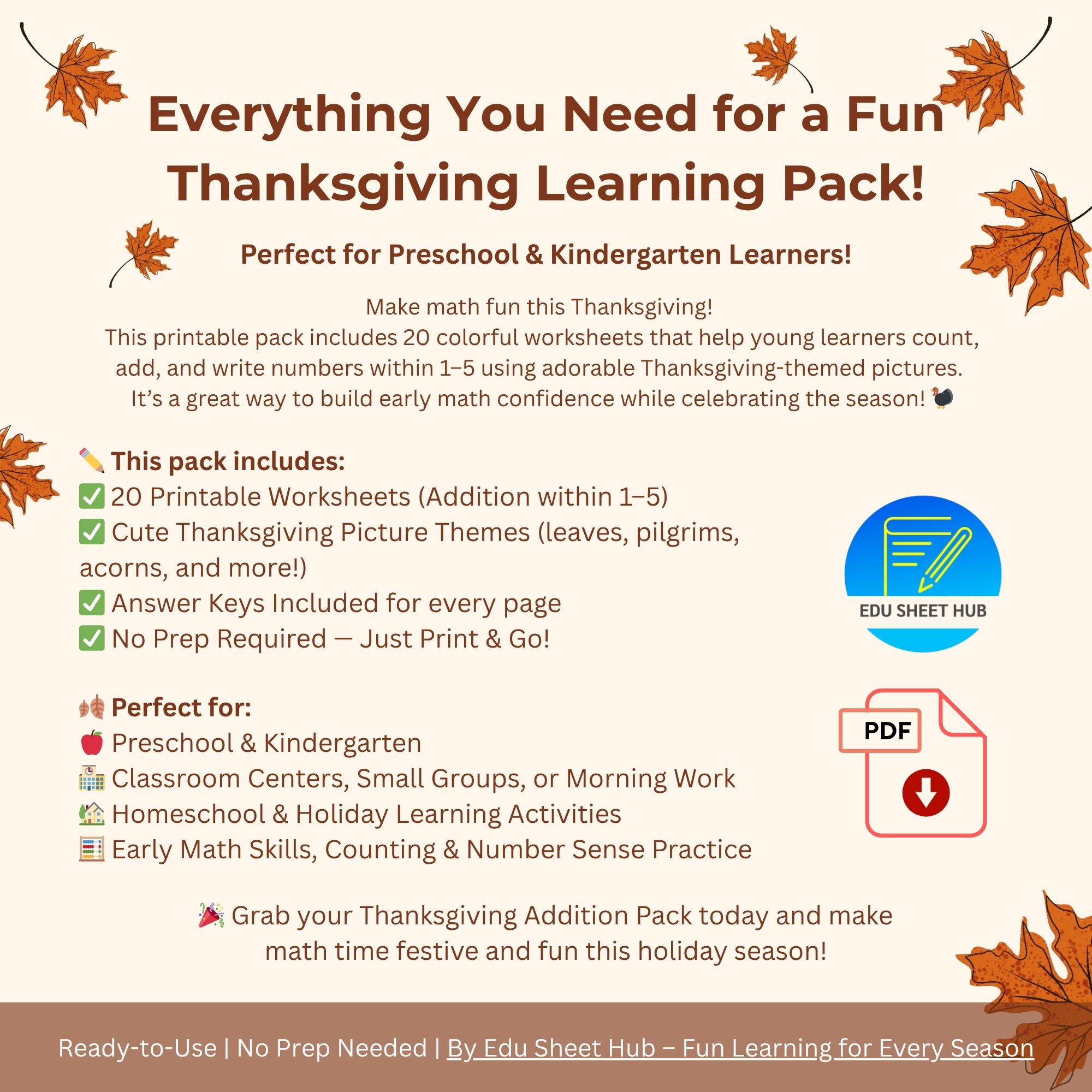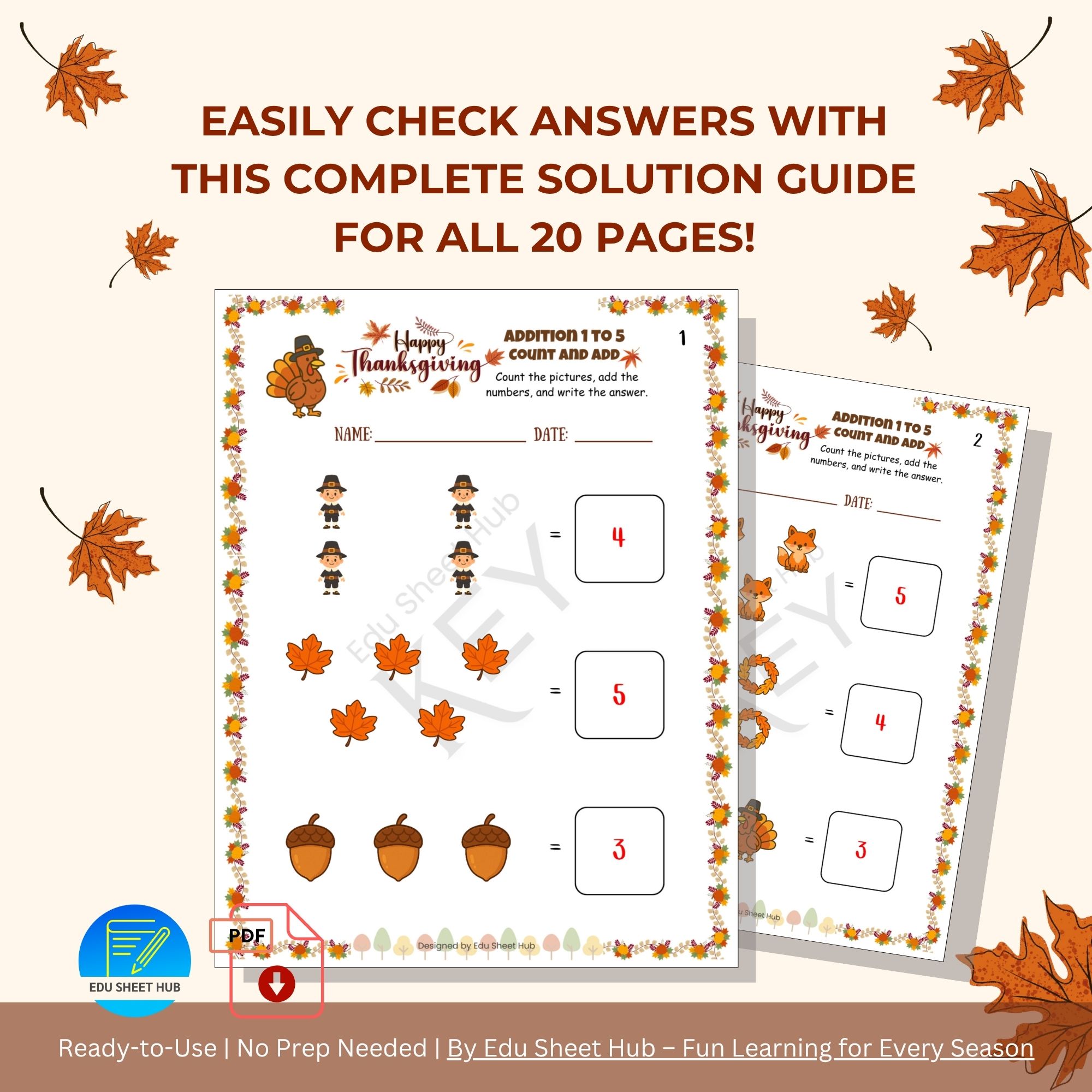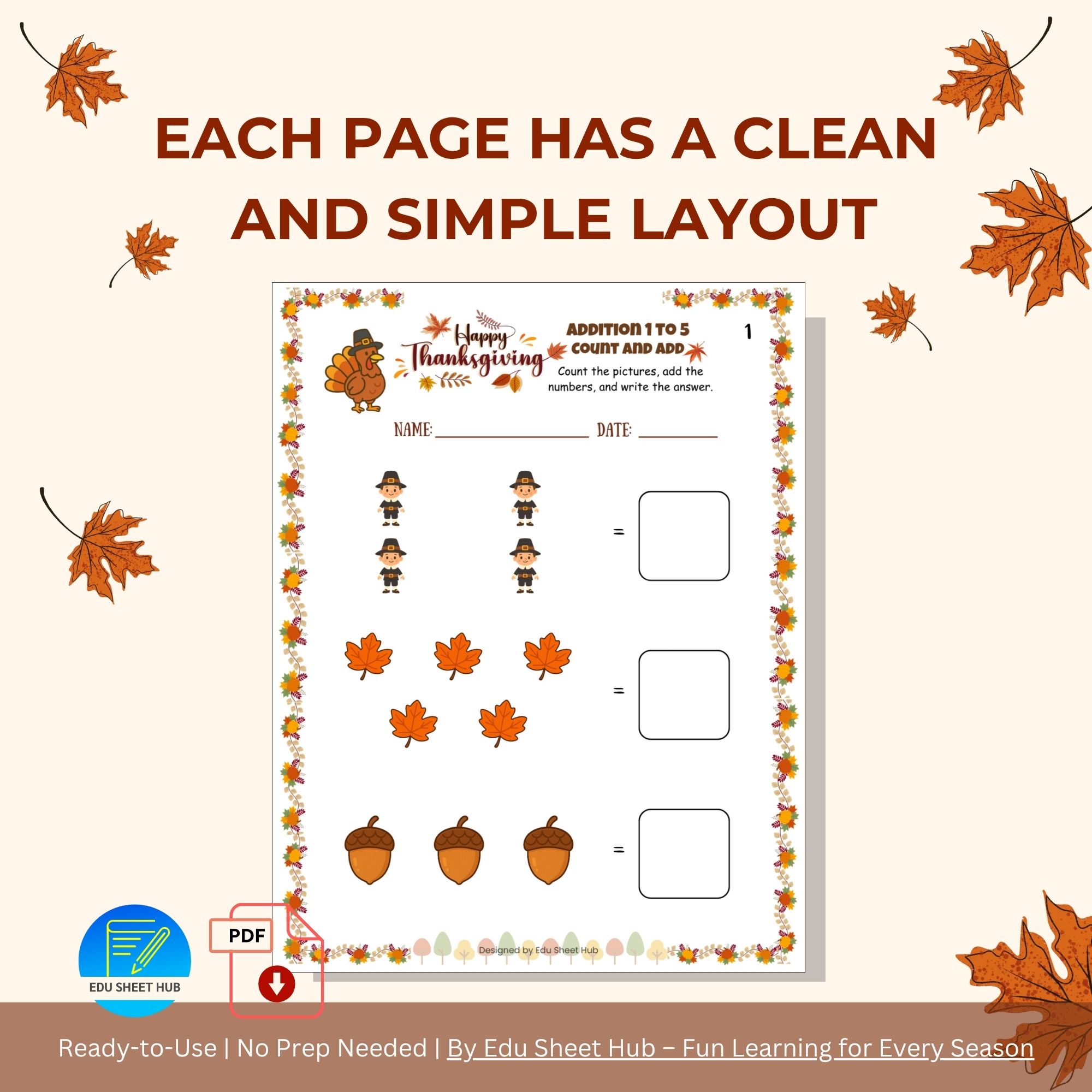 Each page features bright Thanksgiving images (pilgrims, leaves, acorns, turkeys, and more) that make learning to add fun and engaging!