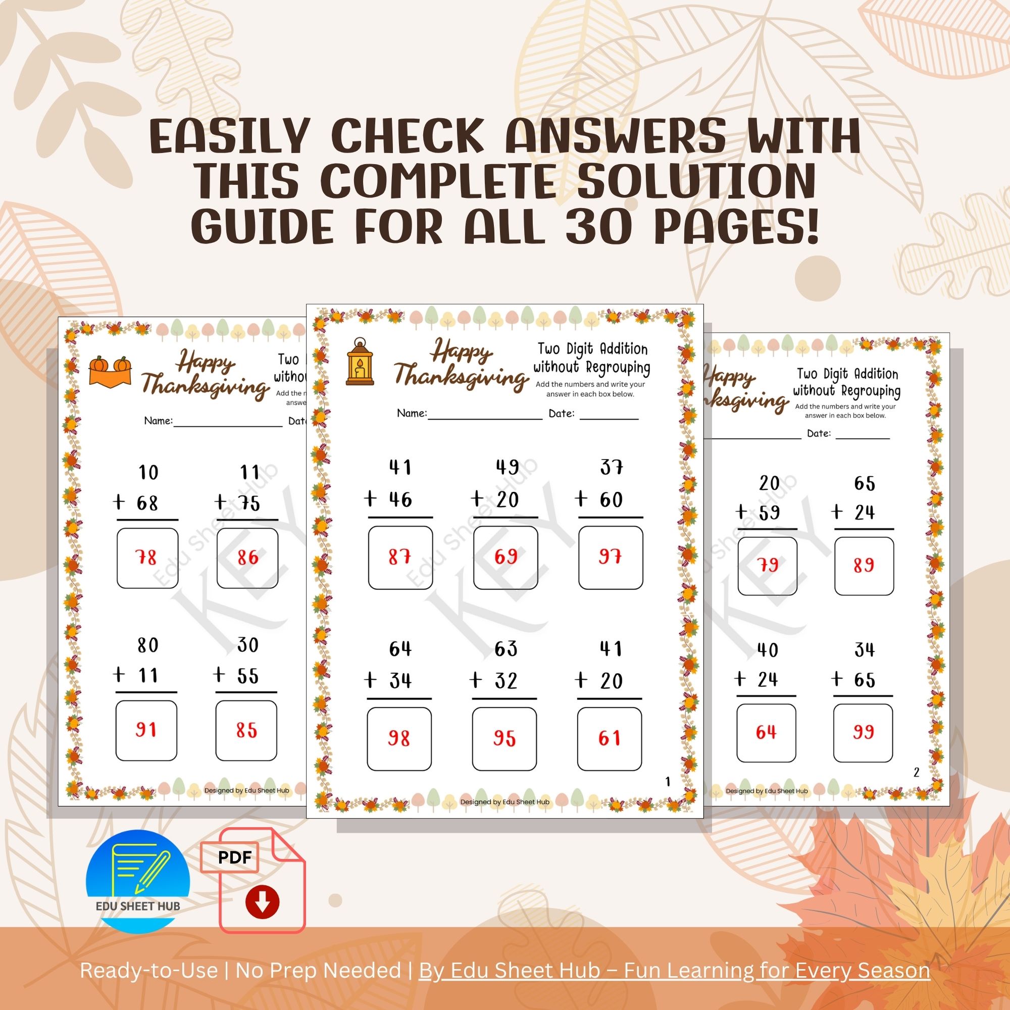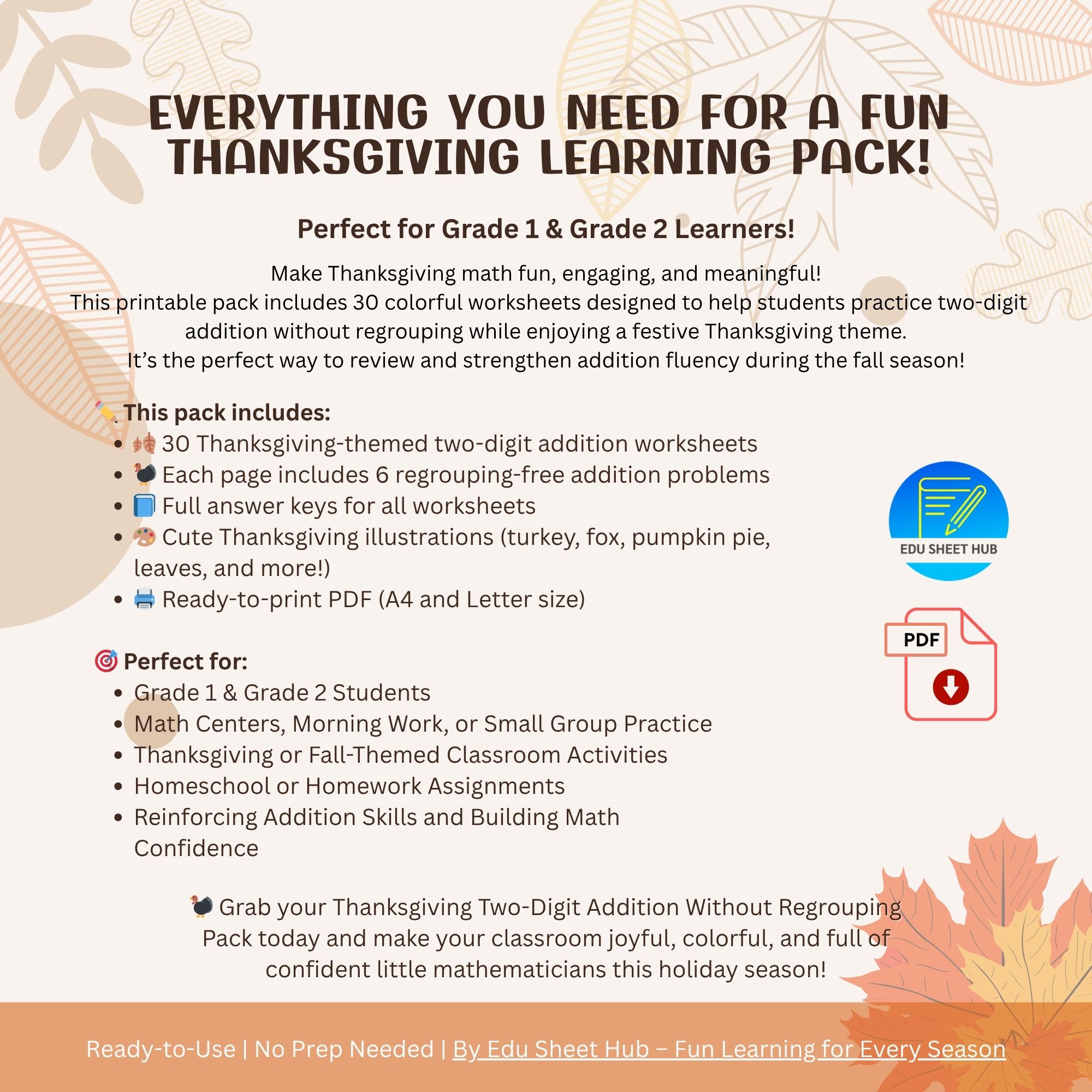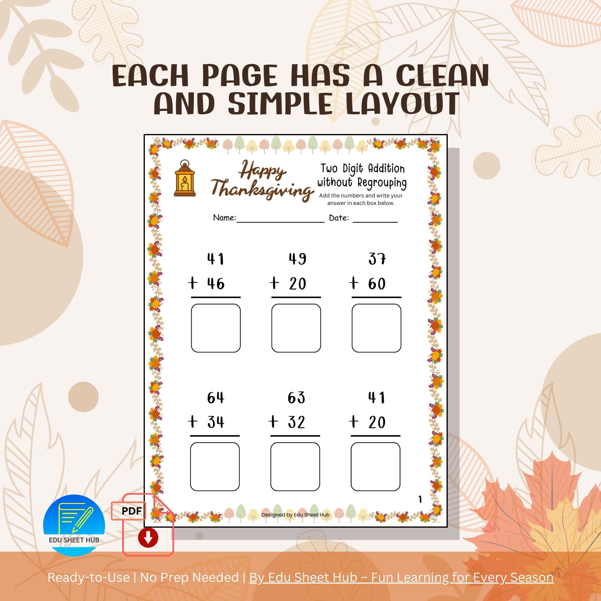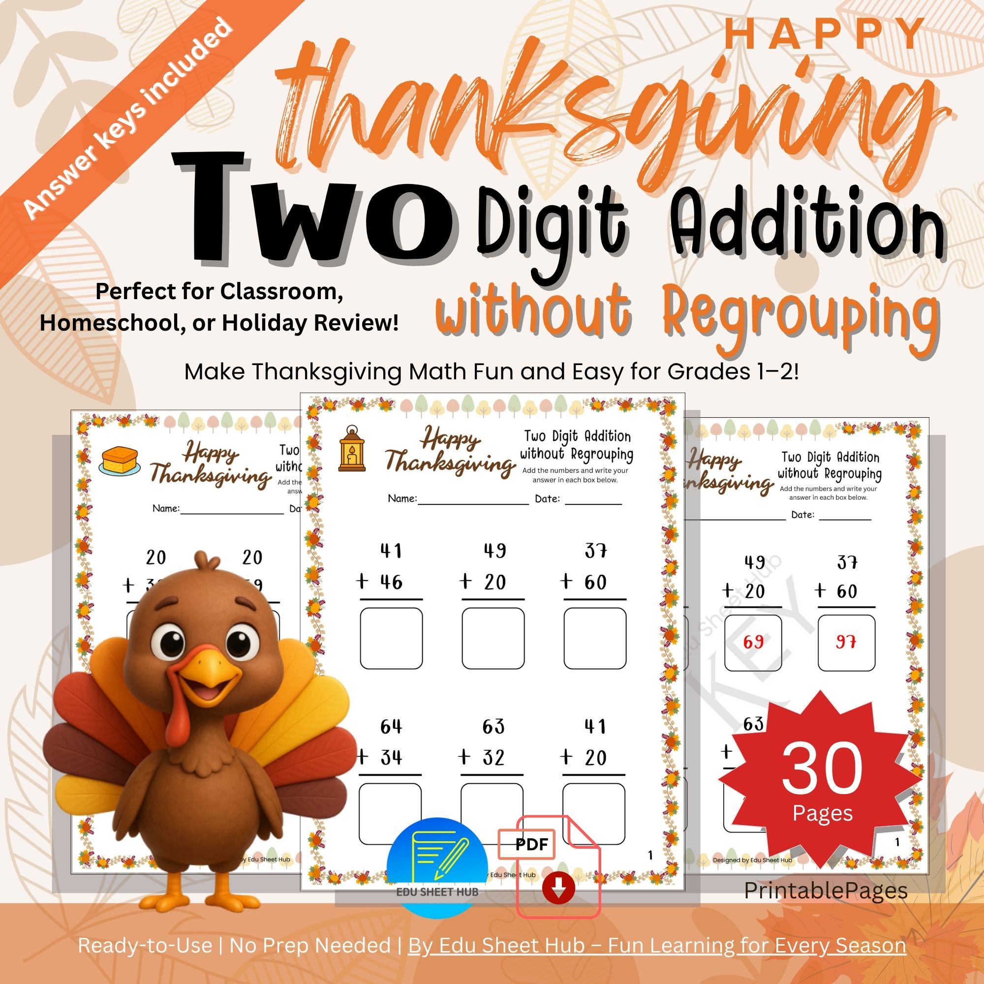 Bring festive fun to your math lessons with this Thanksgiving Two-Digit Addition Without Regrouping Worksheet Pack!